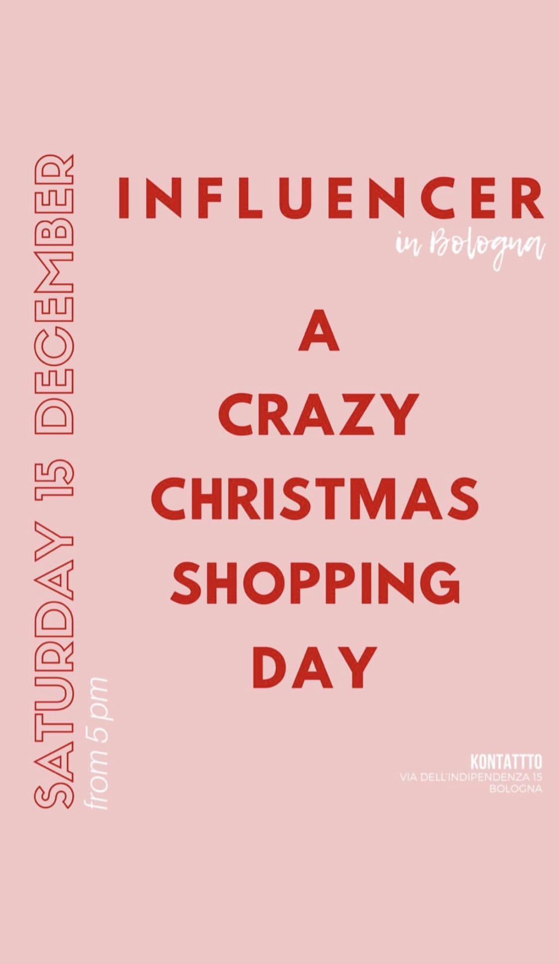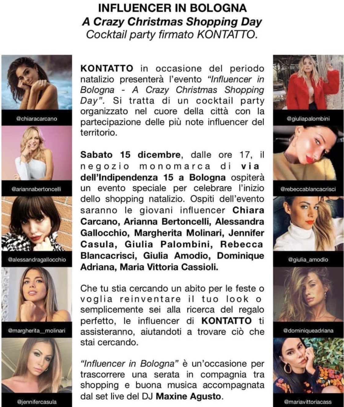 Bologna, 15 dicembre 2018 – Sarà il ‘Crazy Christmas Shopping Day’ l’evento organizzato dal negozio monomarca Kontatto di via Indipendenza, per domani alle 17. Un cocktail party con la partecipazione delle più note influencer del territorio, diponibili a dare una mano per lo shopping perfetto: Chiara Carcano, Arianna Bertoncelli, Alessandra Gallocchio, Margherita Molinari, Jennifer Casula, Giulia Palombini, Rebecca Blancacrisci, Giulia Amodio Dominique Adriana. Musica di dj Maxine Agusto.