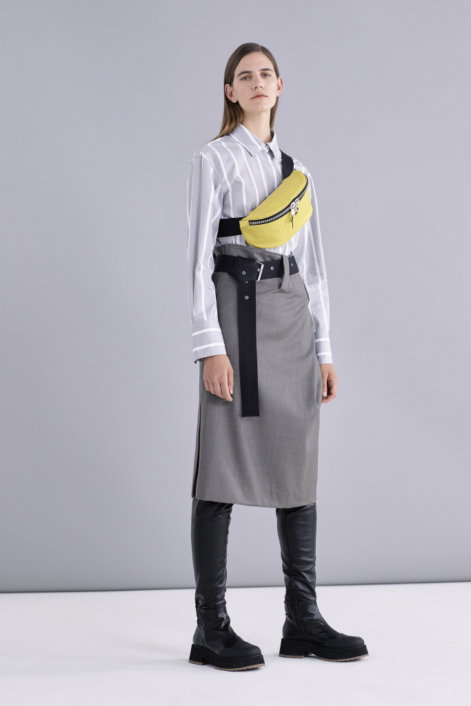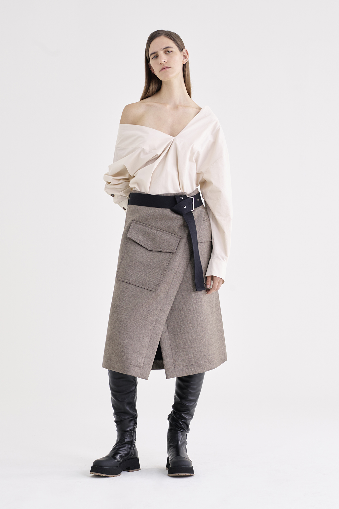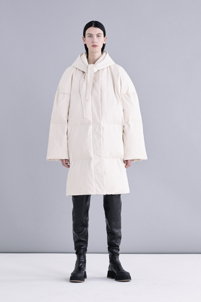 L’aspetto pulito e minimale trasmesso attraverso cappotti stretti, tuniche fluide, pantaloni sartoriali e gonne a pieghe sono stati conditi con elementi sportivi e urbani, tra cui fasce del logo su pantaloni a gamba larga e la silhouette oversize di un piumino che mostra un dettaglio simile a sciarpa ispirato agli anni Sessanta al collo.