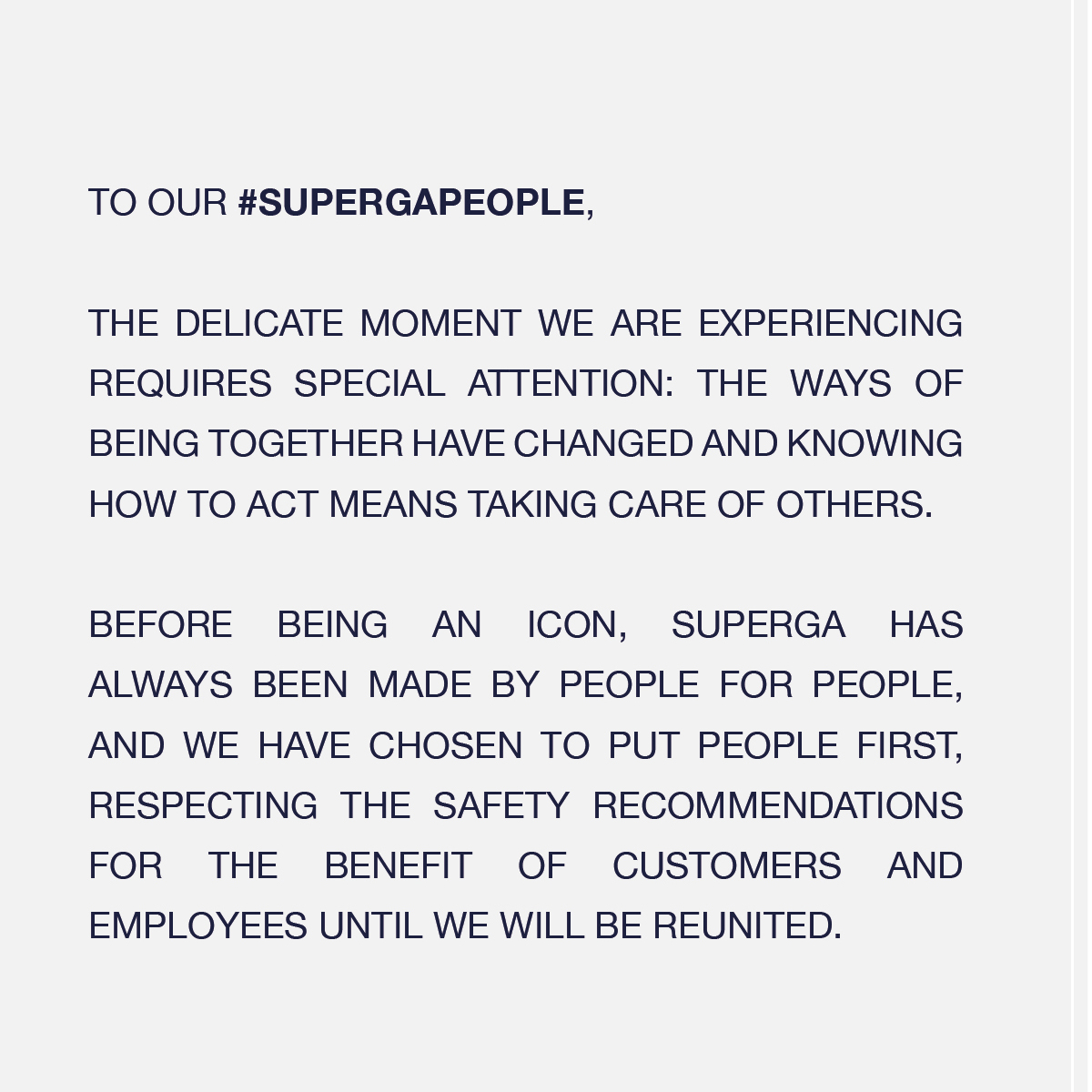 Prima di essere un’icona, Superga è fatta da persone per altre persone e abbiamo deciso di mettere proprio le persone prima di tutto, nel rispetto delle prescrizioni sulla sicurezza per il bene dei nostri clienti e impiegati, finchè non potremo tornare a stare tutti insieme.
